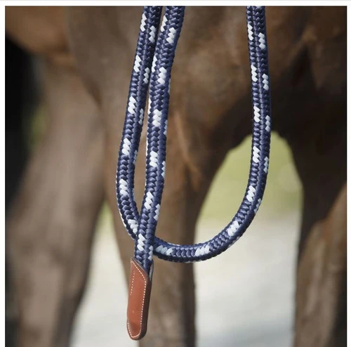 Antarès Lead Rope represents a definite step above the usual nylon lead rope for horses. This round woven nylon lead rope from Antarès has navy and a light blue/grey in a crisp pattern plus quality hardware and fine brown leather trim with cream stitching.