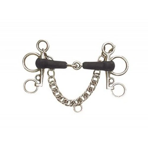 Rubber Mouth Tom Thumb Pelham Bit has a Metalab stainless steel jointed mouth covered in hard rubber. Single jointed snaffle mouth Tom Thumb bit has 4″ Pelham cheeks. Stainless steel curb chain is included. Available in sizes: 4.5, 4.75, 5, 5.5.