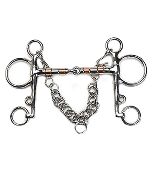 This Copper Roller Mouth Pelham Bit is a single jointed snaffle made of stainless steel with copper roller sections. Copper encourages the horse to salivate and soften while the rollers help placate a busy-mouthed horse. Featuring a jointed mouth and 5″ cheeks, this bit is available in size 5 only.