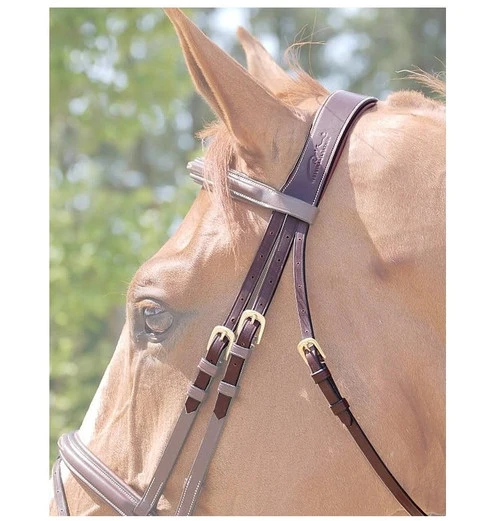 Dy’on Anatomic Crownpiece is a large padded headpiece for your English bridle. The Dy’on crown piece is anatomically designed to curve around the base of the ears, allowing the horse to move his ears without annoying restriction. The padded crown is lined with 2 mm neoprene for cushioning. Dy’on English leather is vegetable tanned and is soft and supple. Available in Black (not shown) or Brown. Anatomic crown is reinforced with cream stitching along the edges. All-in-one design incorporates the noseband cheek pieces and throat latch for a streamlined silhouette that reduces bulk.