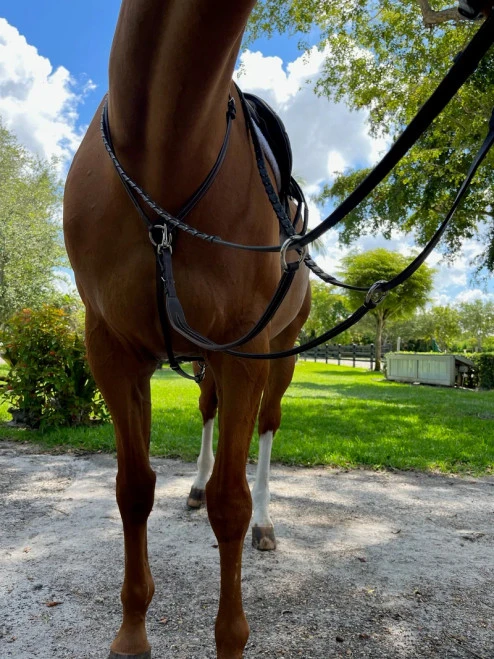 The DziaSport Yoke is that multipurpose tack item that you will use often on different horses and for riders of all abilities. The yoke gives riders and trainers options for use as a grab strap or to attach a running martingale or draw reins. A grab strap is so reassuring to beginner riders and prevents unsteady hands from pulling on the reins to balance. The yoke/grab strap is just as reassuring to expert riders when working with a green or unpredictable horse. The center ring lets you clip or buckle on a running martingale attachment.