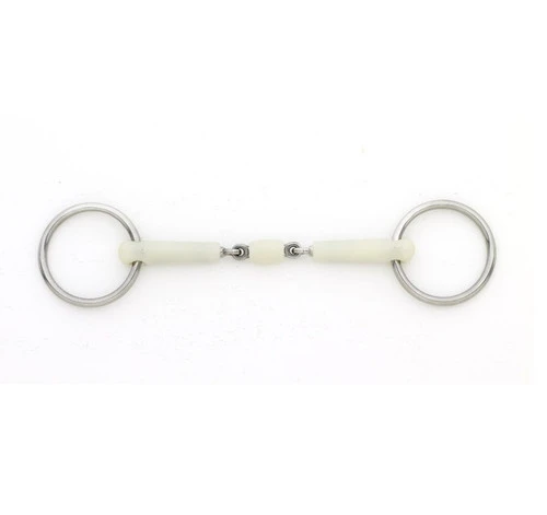 The Double Jointed Bradoon from Happy Mouth has a stainless steel construction with space age polymer coating. The center lozenge rotates. It is a loose ring dressage bit in 3 sizes to fit most horses. Please check with your equestrian competition organization to confirm this bit meets its standards.