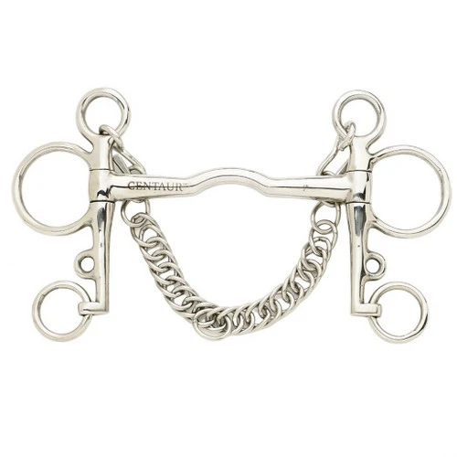 Centaur Stainless Steel Polo Pelham with 5 inch cheeks is a classic standard ported bit for the sport of polo. Stainless steel bit from Centaur comes with curb chain included. This ported mullen mouth English curb bit has a lifetime guarantee against rust. Polo pony bit is available in sizes 5, 5.5.