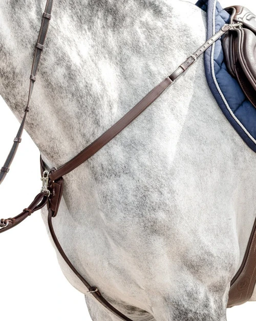 The Prestige Pegaso Breastplate allows an excellent fit for your horse with several adjustment points. The English breastplate attaches to the saddle dees with swivel clips. The Pegaso Breastplate is made with fine Italian leather with silver tone hardware. The running attachment has swivel clips so it is easy to attach and remove. The rings are carabiners that can be opened to insert the reins. Beautifully finished, with all the quality touches you look for in Prestige Italia tack.