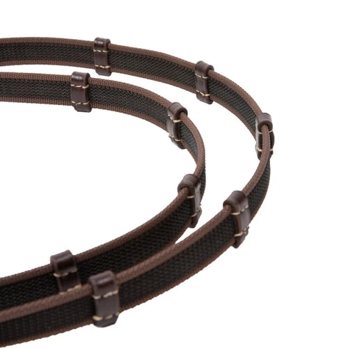 Antarès Signature collection web reins feature roller buckle ends and double keepers for easy and secure attachment to the bit. Signature by Antarès Web Reins with Stops are available in Cob, Full, and Oversize in brown.