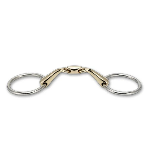 Stubben Steeltec Sweet Copper Angled Loose Ring Bit has a Sweet Copper mouthpiece to encourage salivation and sensitivity. Three-piece bit is comfortably curved to fit the mouth and is available in sizes: 5, 5.25 , 5.5 , 5.75. The Stubben Steeltec Angled Loose Ring Bit features Stubben’s special Sweet Copper mouthpiece comprised of 89% copper, 7% hardened iron + aluminum, and 4% zinc, and does not contain any nickel (a potential allergen). Sweet Copper is very strong, has a sweet taste that encourages salivation for a more sensitive mouth, and just feels good to the horse. Stubben bits are made with the highest quality workmanship, from the development of the Sweet Copper alloy, to the way the holes for the rings are drilled (the holes are actually curved, so there aren’t any edges to catch the rings, allowing for especially smooth action).
